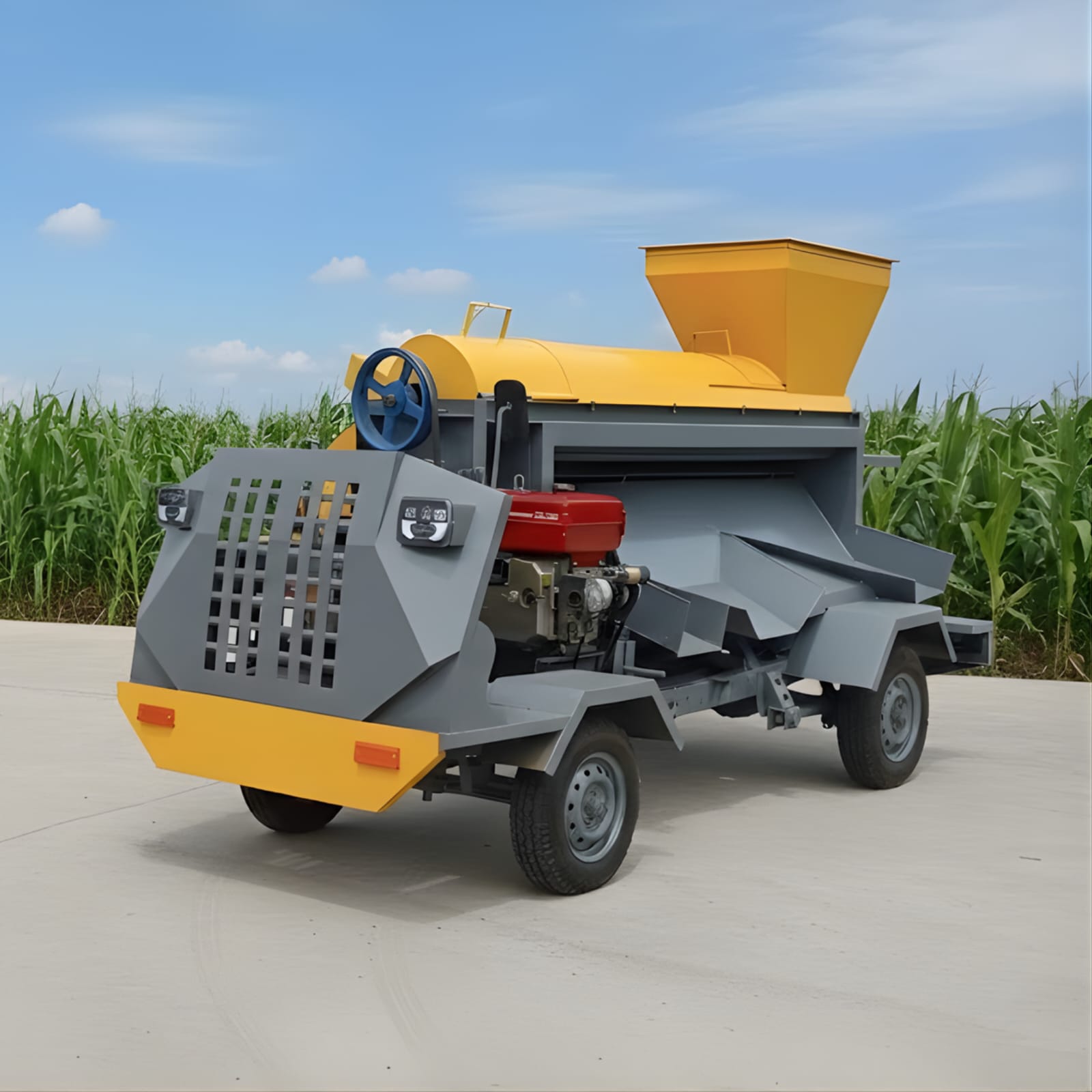 Mesin pemipil bermanuver 4 roda untuk mempercepat proses pemisahan biji jagung dari bonggol secara langsung dan bersih di lokasi panen.